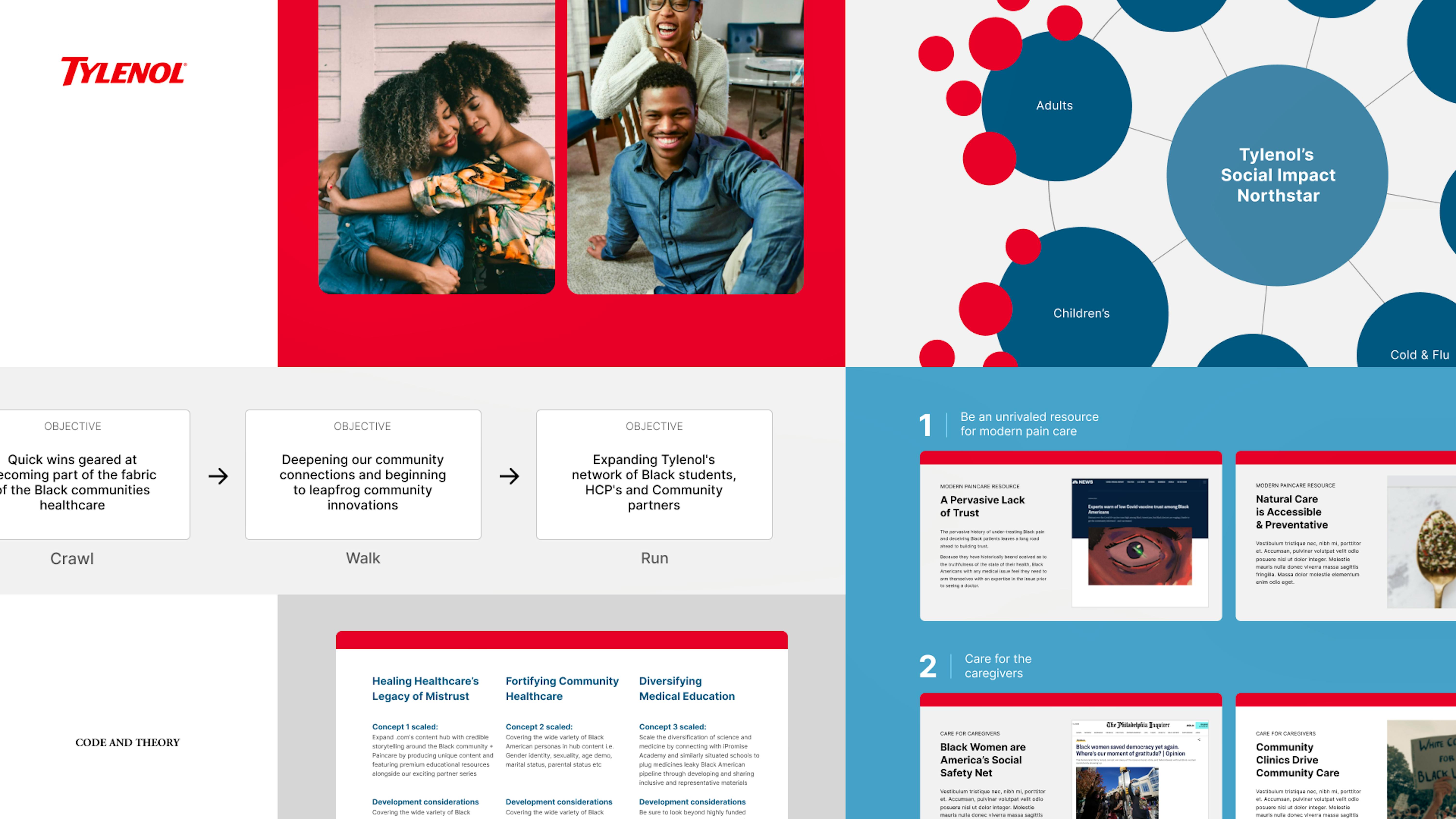 By conducting a social listening audit to identify and understand Black American experiences with pain and the key emotions they were using to discuss/describe it, we learned that pain and pain care within the Black community is intrinsically linked to biases within the American healthcare system. We worked with Tylenol to establish a social impact northstar and carve out unique opportunities for the brand to tackle a future focus of Black American impact.