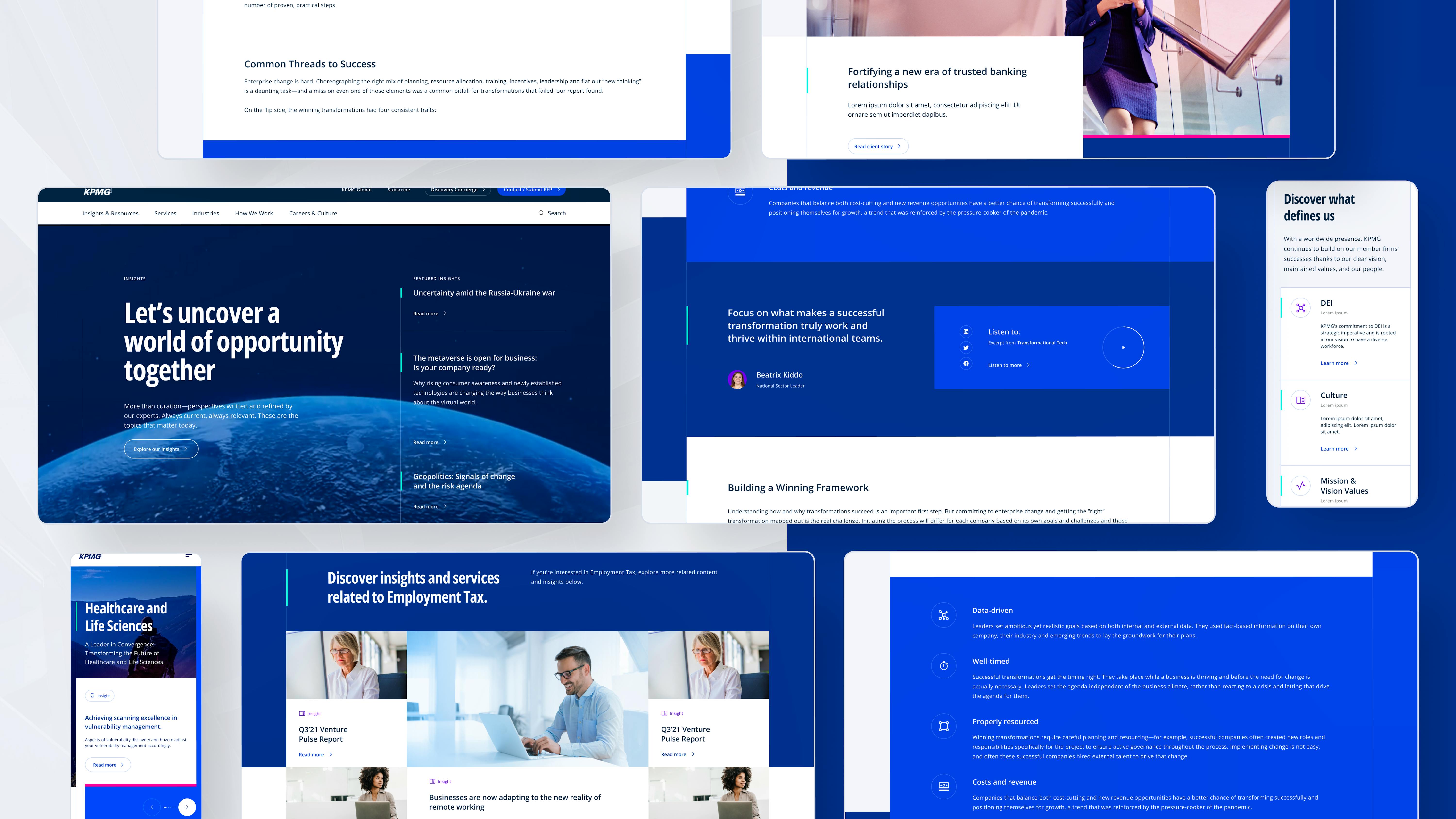The new architecture and product system (24 templates and 80+ modules) was developed with flexibility in mind to ensure the new site would accommodate a range of use cases and meet specific requirements across business lines over time. The newly established brand work was evolved into a digital visual design library that can extend across KPMG US’ full suite of properties.